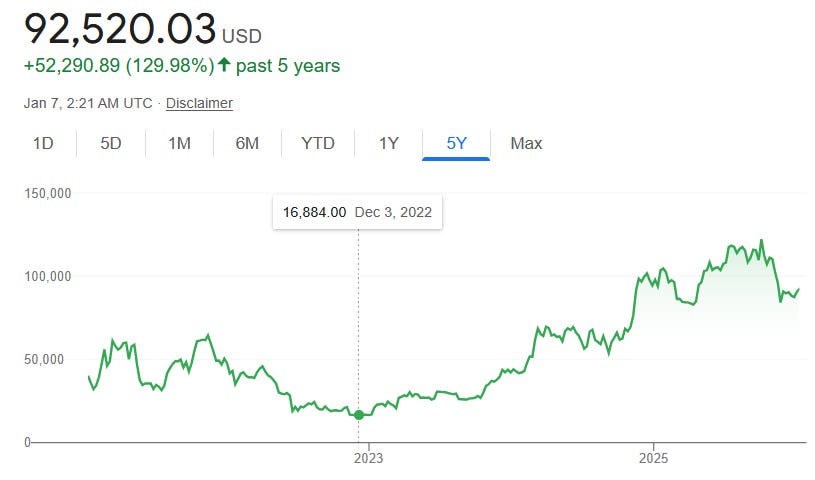 From this one year chart as of 1/6/26, you can see that BTC is volatile, but if you look at the 2nd chart, going back to Jan 2021, the overall trend has been up.
