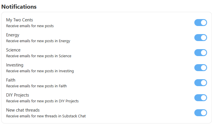I’ll use my substack as an example of how you can narrow it down if you want to. I hope I’m not cutting my nose off in spite of my face, because I’d love for you to read everything I write. But I write about a lot of different things. Perhaps you read my posts on a particular subject but aren’t at all interested in one of the other subjects that I write about. You can de-select the topic you’re not interested in and just receive the emails you want.